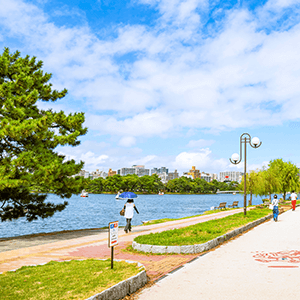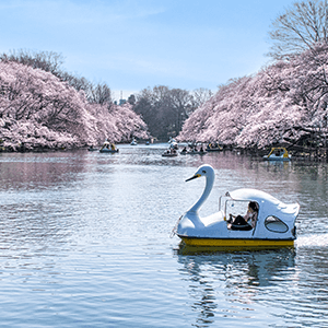 池の周囲には約200本の桜があり、春は薄桃色、夏は緑に衣替えし、秋には黄色から赤まで種々の葉に彩られます。四季折々の美しい風景を、ぜひボートに乗りながら楽しんでみてください。