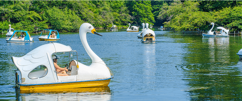 池の周囲には約200本の桜があり、春は薄桃色、夏は緑に衣替えし、秋には黄色から赤まで種々の葉に彩られます。四季折々の美しい風景を、ぜひボートに乗りながら楽しんでみてください。