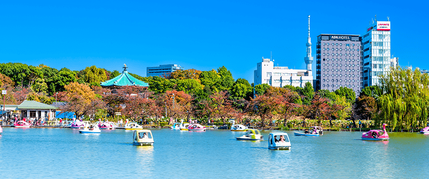 池の周囲には約200本の桜があり、春は薄桃色、夏は緑に衣替えし、秋には黄色から赤まで種々の葉に彩られます。四季折々の美しい風景を、ぜひボートに乗りながら楽しんでみてください。